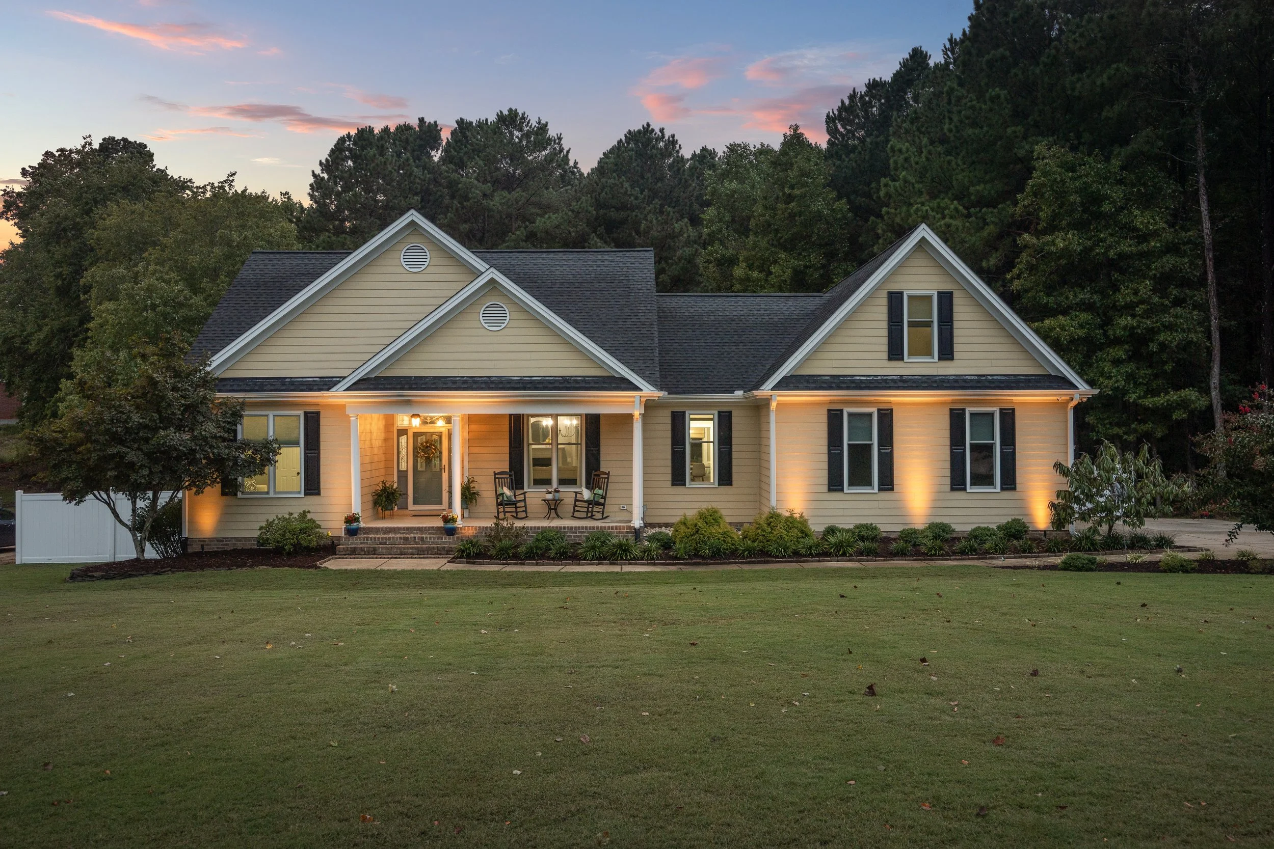Daytime shots are transformed to twilight images by replacing the sky and adjusting the lighting in post-production for a beautiful twilight effect.